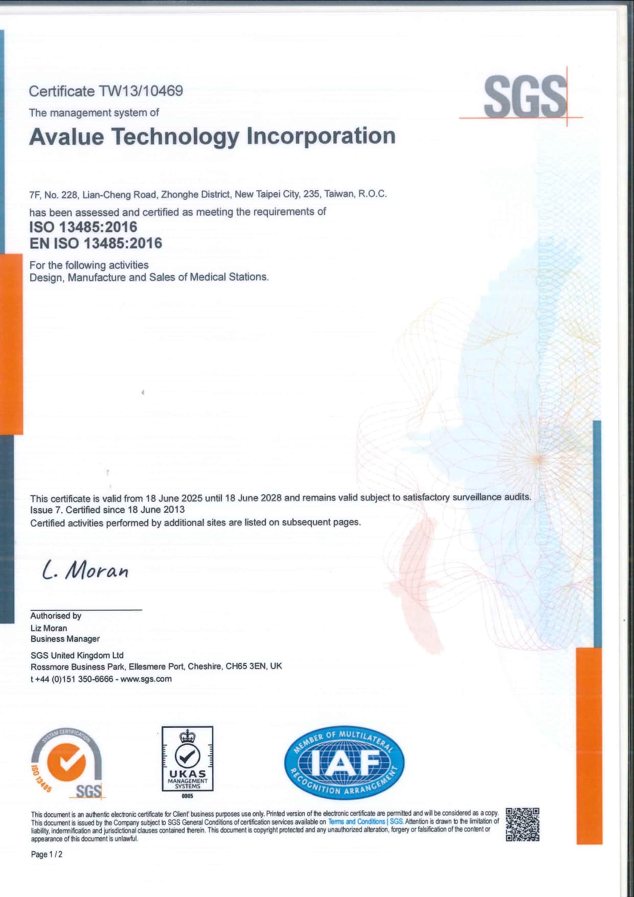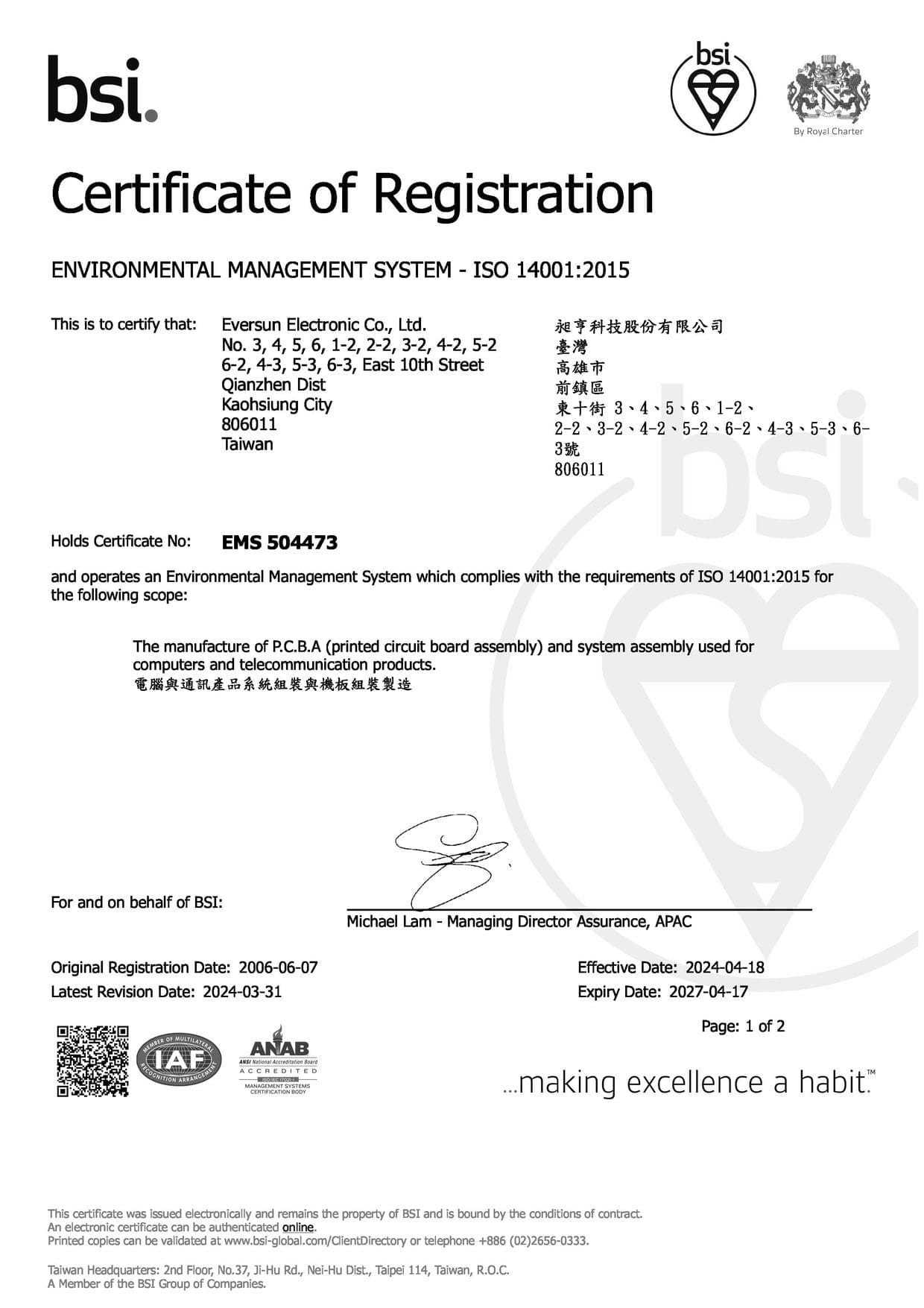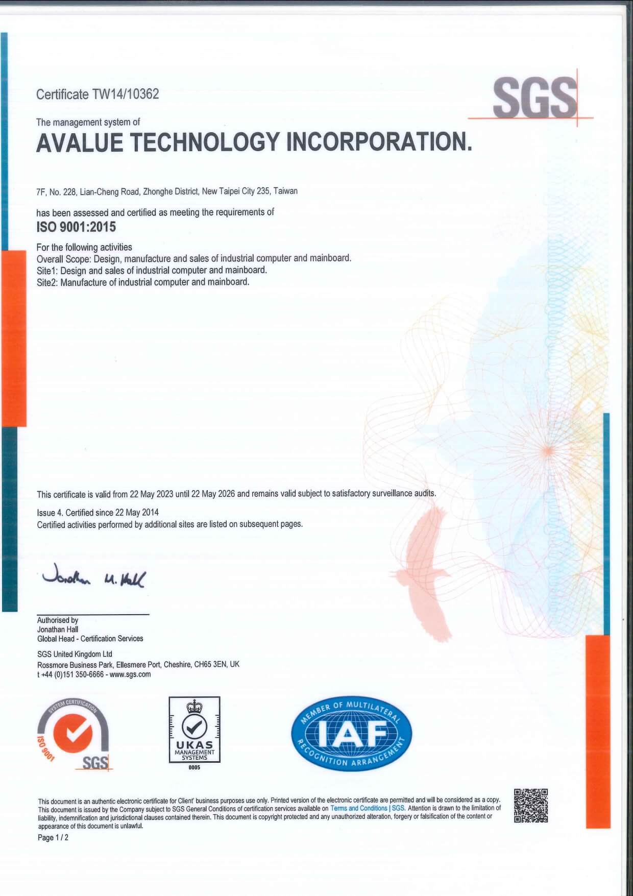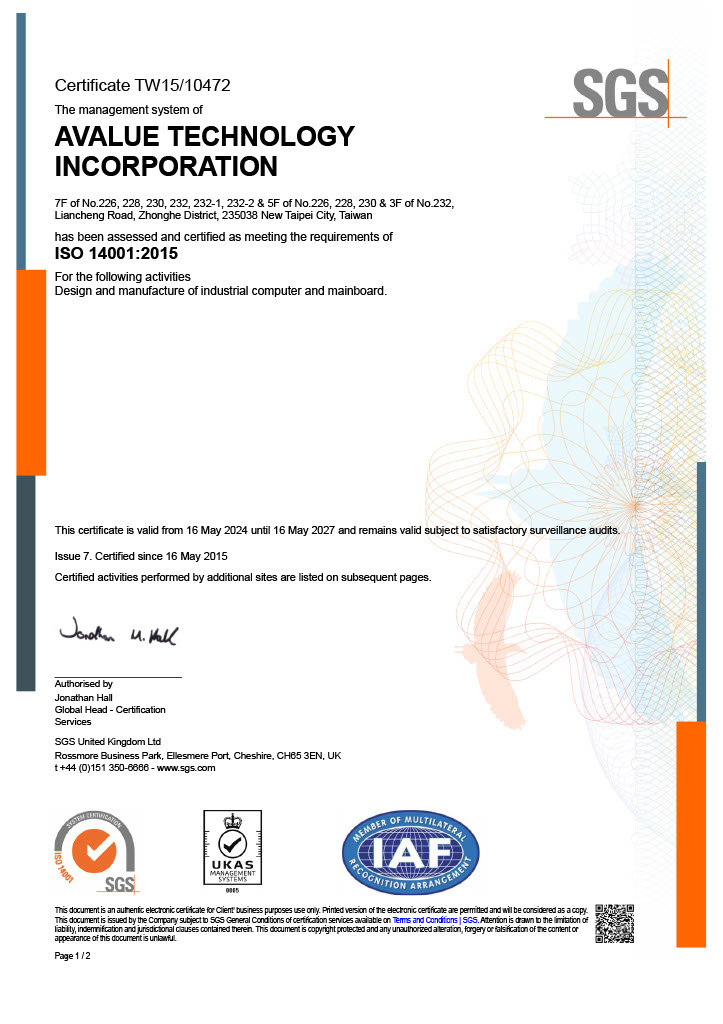 Avalue has achieved certification in the internationally recognized ISO 9001, ISO 13485, ISO 14001, ISO 45001, and ISO 27001 standards. Additionally, its subsidiary Eversun is also certified in ISO 9001, ISO 13485, ISO 14001, and IATF 16949 (Automotive Industry Quality Management System).