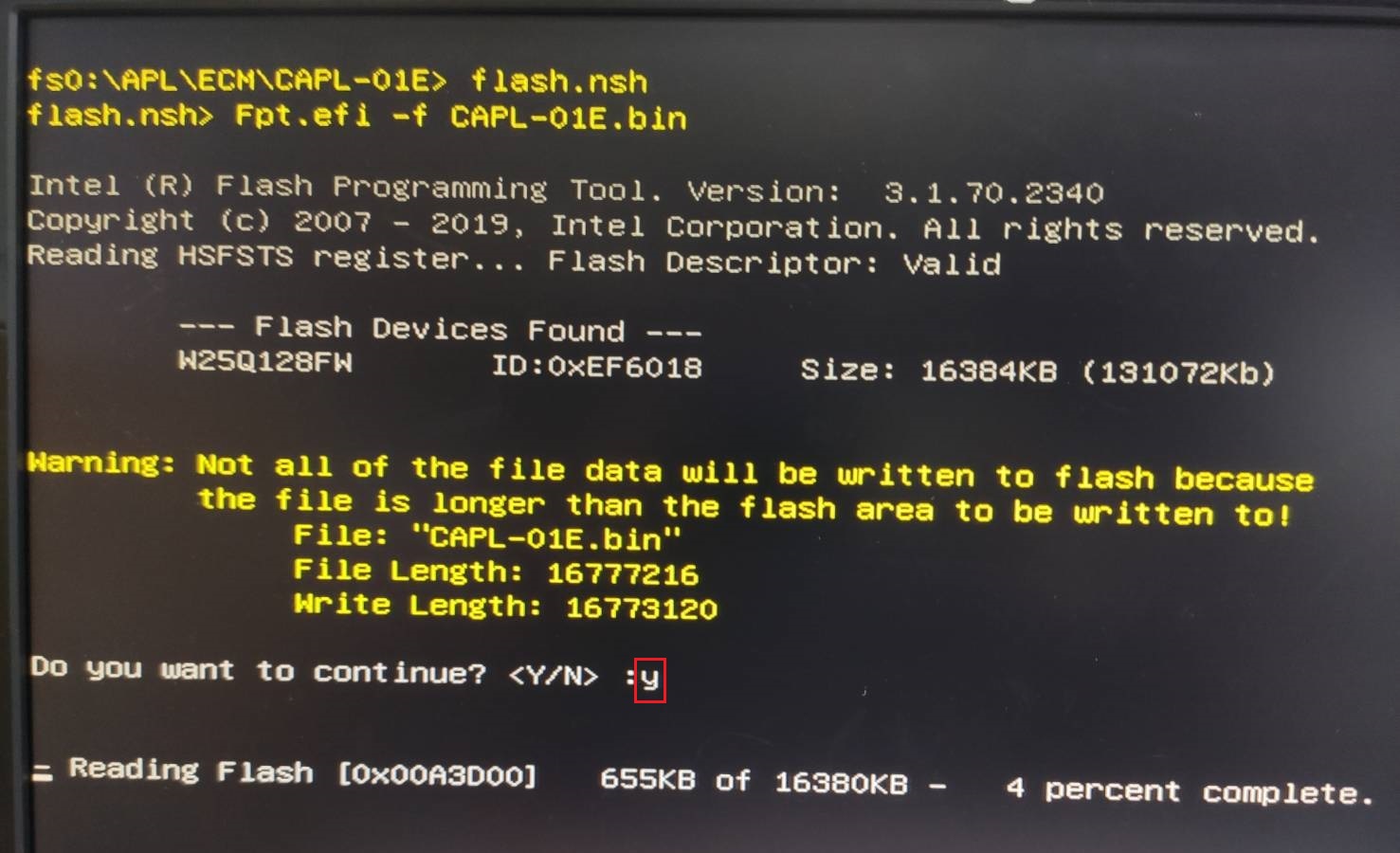 5. Run flashfpt.nsh to start upgrade BIOS and ME firmware.