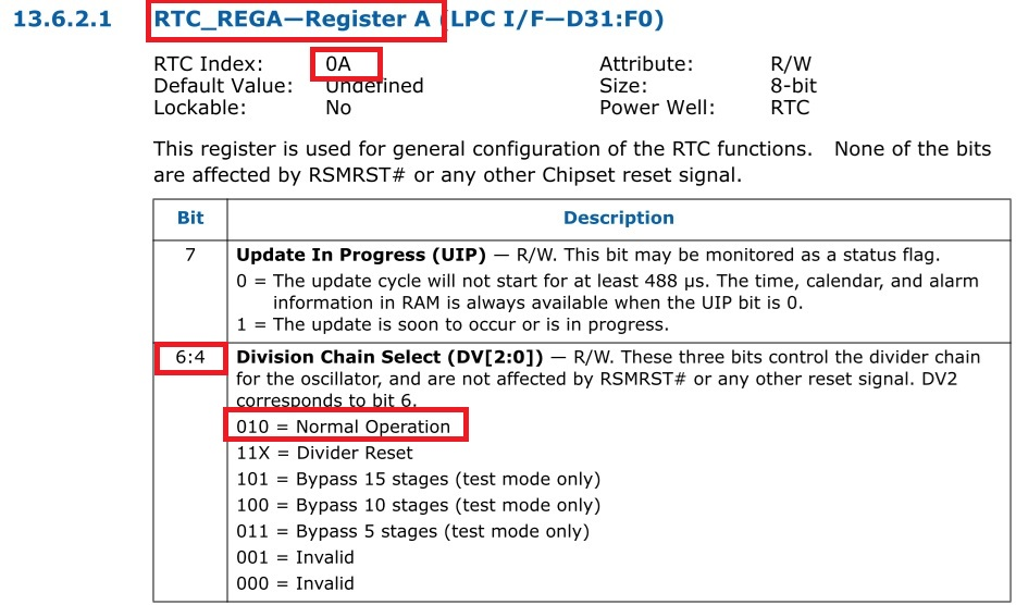 RTC_REGA- Register A, bit [6:4] = 010 =Normal Operation