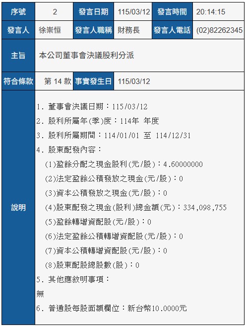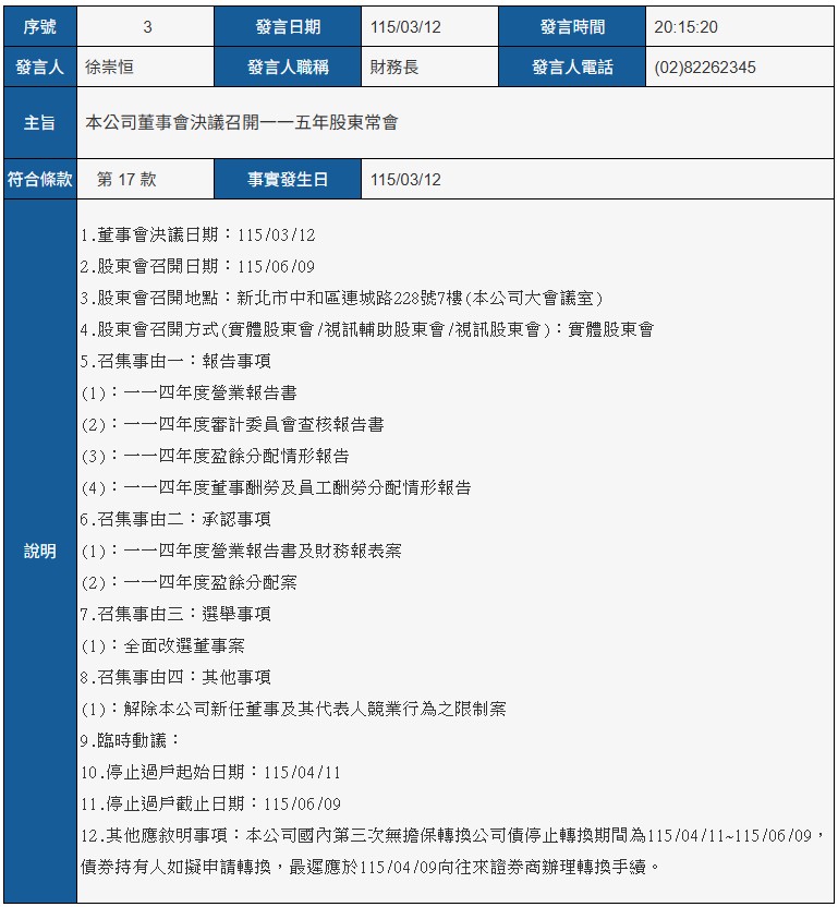 本公司114年度合併財務報告董事會預計召開日期為115年3月12日