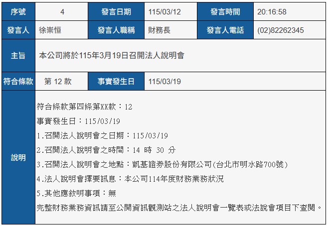本公司將於115年3月19日召開法人說明會